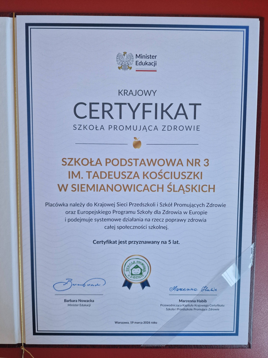 20 marca w Ministerstwie Edukacji Narodowej w Warszawie odbyła się uroczysta gala wręczenia Krajowych Certyfikatów „Szkoła Promująca Zdrowie”. Z ogromną dumą informujemy, że nasza szkoła jako PIERWSZA w Siemianowicach otrzymała to prestiżowe wyróżnienie – i co szczególnie ważne, jesteśmy JEDYNĄ szkołą w naszym mieście posiadającą ten Certyfikat!