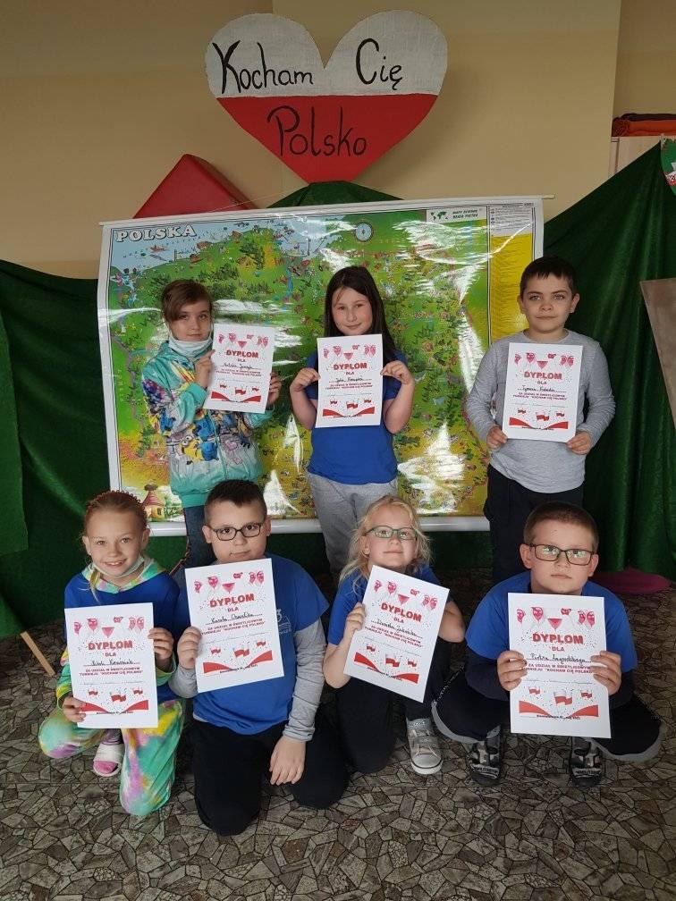 uczniowie prezentują dyplomy udziału w Kocham Cię Polsko